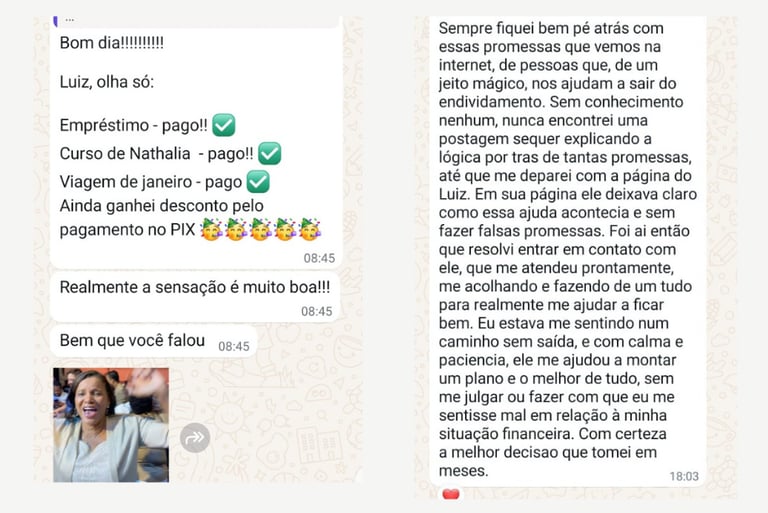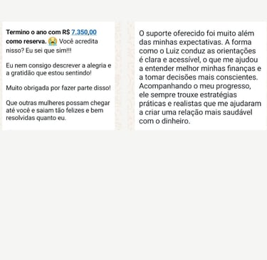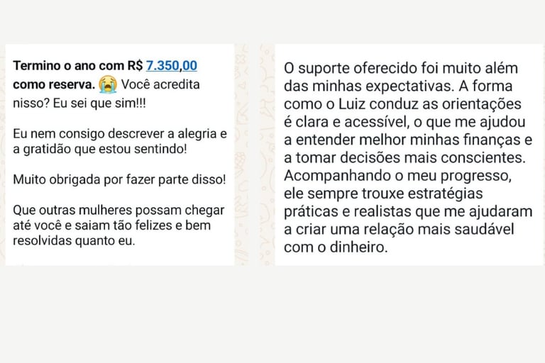 Importante: Os resultados dependem do comprometimento e da situação financeira de cada pessoa. Não garantimos resultados específicos ou milagrosos. Nosso trabalho é oferecer orientação, ferramentas e estratégias para auxiliar na organização financeira e no planejamento pessoal.